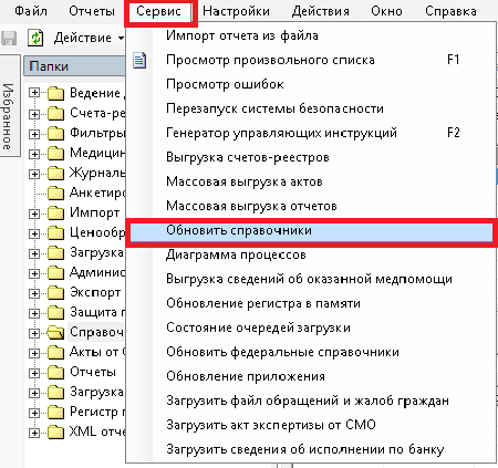 На главном меню приложения необходимо выбрать пункт <Сервис>, одним нажатием левой кнопки мыши открывается список сервисных функций приложения. Для дальнейшей работы следует выбрать <Обновить справочники >, как показано на рисунке ниже.