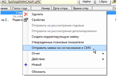 В утвержденном территориальным фондом ОМС плановом задании может быть сделано или скорректировано распределение объемов МП по страховым компаниям, как это описано в п. 4, а затем заявка может быть отправлена на утверждение в страховую компанию. Для этого отредактированную необходимым образом заявку нужно выделить в списке и выбрать в контекстном меню пункт «Отправить заявки на согласование в СМО», как это показано на рисунке снизу.