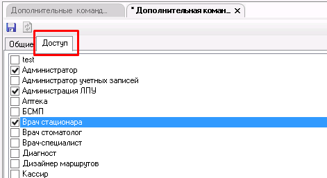 8. На вкладке “Доступ” выбираются роли, для пользователей которых будут отображаться эти вкладки. Если роли не выбрать, вкладки не будут видны никому.