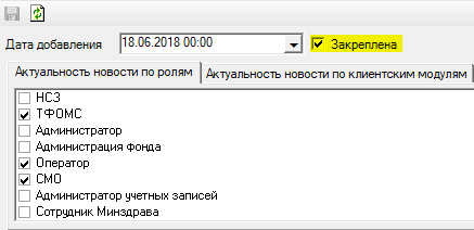 Раздел настройки видимости | Раздел содержит три вкладки. · На первой «Актуальность новости по ролям» указывается перечень ролей системы, которым должна быть видна данная новость. · На второй вкладке «Актуальность новости по клиентским модулям» можно указать клиентские модули. В этом случае новость будет видна всем пользователям, которым доступен данный модуль. · Третья вкладка «Актуальность новости по группам пользователей» отображает список групп пользователей. В этом случае новость увидят все пользователи, включенные в отмеченную группу (группы). |