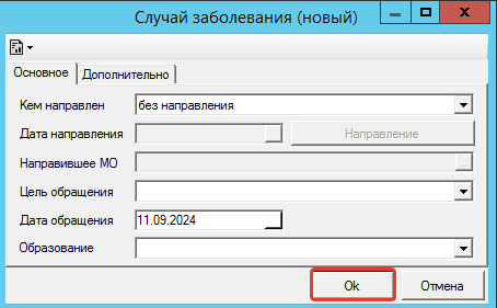 Необходимо создать случай обращения пациента, через кнопку «Принять пациента».