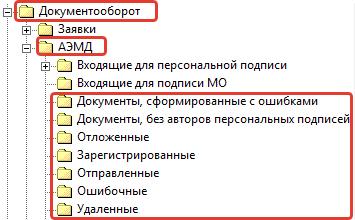 После отправки документов, они будут хранится в папке «Документооборот» - «АЭМД» и далее в подпапке , в зависимости от статуса отправки (зарегистрирован, отправлен, ошибка и др.).