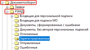 После отправки документов, они будут хранится в папке «Документооборот» - «РЭМД» и далее в подпапке , в зависимости от статуса отправки (зарегистрирован, отправлен, ошибка и др.).