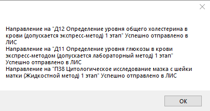 Наличие данного уведомления, свидетельствует об успешном формировании и отправке электронных направлений в ЛИС. Нажмите ОК