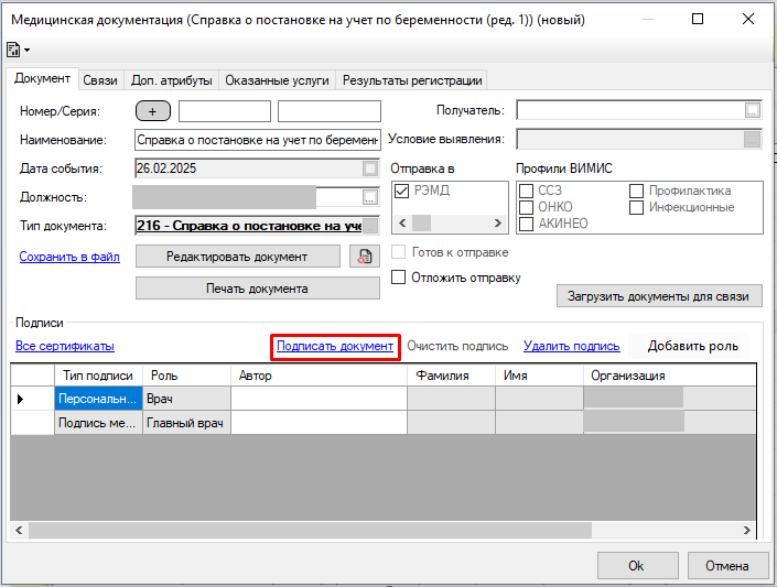 После проверки данных нажать на кнопку «Ок». Откроется форма подписи документа. Необходимо нажать на кнопку «Подписать документ», чтобы поставить подписи врачей.