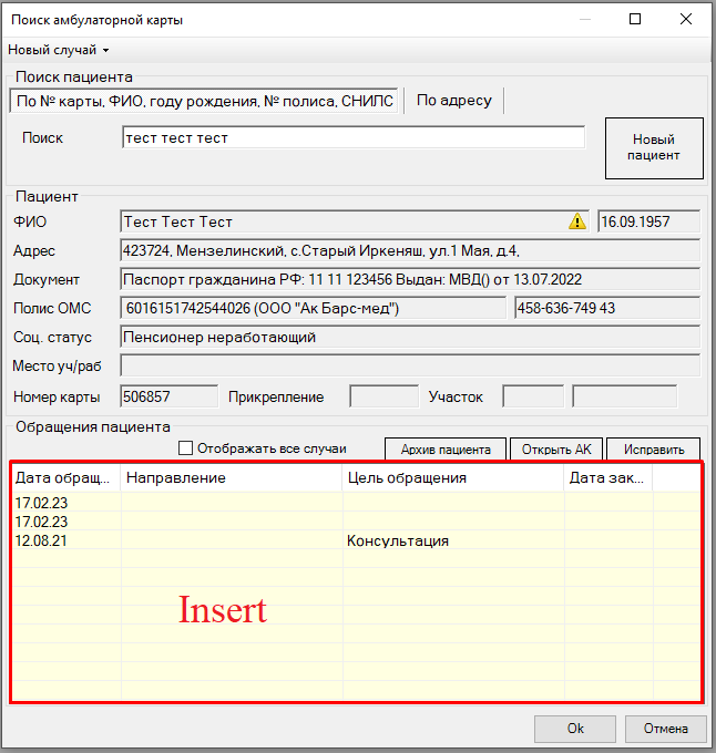 В разделе «Обращение пациента» необходимо нажать мышкой на разлинованное поле и с помощью кнопки на клавиатуре «Insert» создать новый случай.