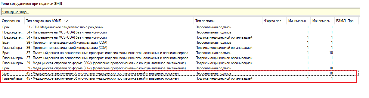 В открывшемся окне «Роли сотрудников при подписи ЭМД» выбрать необходимое значение роли с типом документа АЭМД «45 – Медицинское заключение об отсутствии противопоказаний к владению оружием» (двойным щелчком мыши или, активировав строку со значением мышью, нажать кнопку «Ок»).