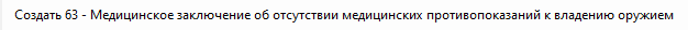 После того, как данные осмотра врача внесены в Программу, можно сформировать СЭМД «Медицинское заключение об отсутствии противопоказаний к владению оружием». Для этого необходимо нажать кнопку вверху формы «Мед.документация» -> «Создать Медицинское заключение об отсутствии медицинских противопоказаний к владению оружием (Редакция 1)»