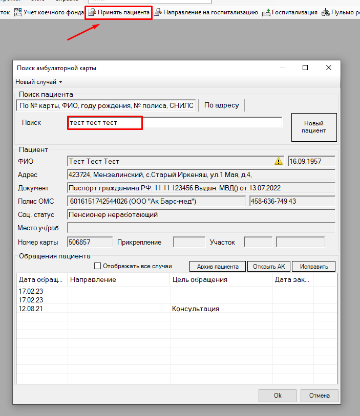 Необходимо создать случай обращения пациента через кнопку «Принять пациента». Откроется форма поиска пациента, где по № карты, ФИО пациента, году рождения и № полиса можно найти пациента.