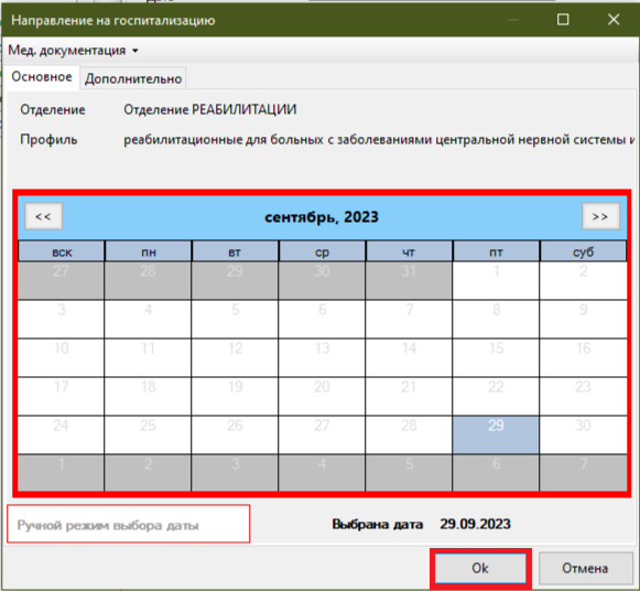 На экране появится календарь, где заведующий отдалением может выбрать и утвердить дату госпитализации пациента. Зафиксировать выбор даты следует нажатием кнопки «ОК».