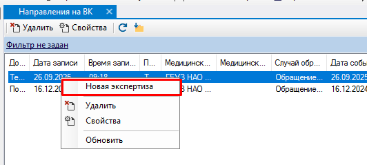 Для проведения экспертизы необходимо выбрать нужное направление и правой кнопкой мыши выбрать «Новая экспертиза».