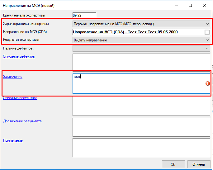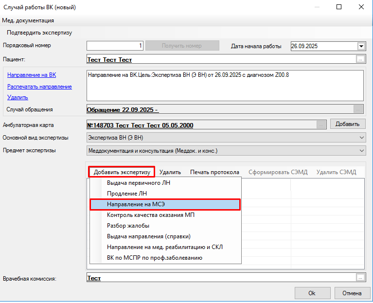 Добавляем экспертизу по одноименной кнопке, из выпадающего списка выбираем «Направление на МСЭ».